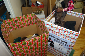 Decorated boxes remind people that their coat is a gift to someone.