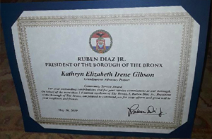 On May 9th, the Bronx Borough President celebrated seniors at a special luncheon for centenarians (95-100 years old) as part of its annual Bronx Week celebration. The event was held at the Villa Barone Manor and 3 GAP members were honored. (The Grandparents Advocacy Group assists grandparents and great-grandparents who in their later years find themselves back in the role of raising their young grandchildren, as the parents of the children struggle with drugs or are lost to prison.)