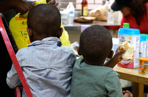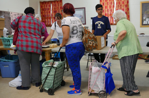 Across the parking lot in a separate building-residents line up for weekly groceries.