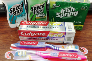 These kits included full sized products including: a 3-pack of Irish Spring soap, two sticks of deodorants, two toothbrushes and a tube of Colgate toothpaste.