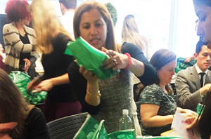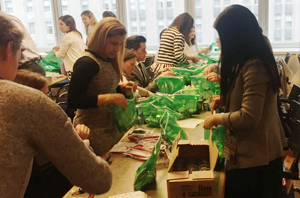 Corporate volunteers spent the afternoon preparing dozens of "personal care kits" for our clients who may not necessarily have the means to purchase these essential items. These kits held full size products including: a 3-pack of Irish Spring soap, two sticks of deodorants, two toothbrushes and a tube of Colgate toothpaste.