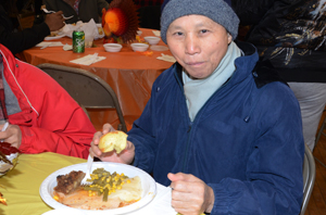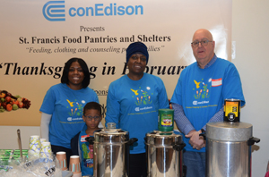 "Thanksgiving in February" was co-sponsored by our friends at Macy’s and ConEd, who collectively sent almost four dozen volunteers to St John’s church hall, all of whom helped serve food to literally hundreds of people in need. St. John’s Bread of Life Food Pantry and the Grandparents Advocacy Project and their clients were welcome guests. We served a delicious and filling Thanksgiving-style meal of turkey with all the trimmings. In addition, every adult guest left with a hygiene kit (donated by Colgate) and every kid received a plush toy (donated by Animal Adventure).